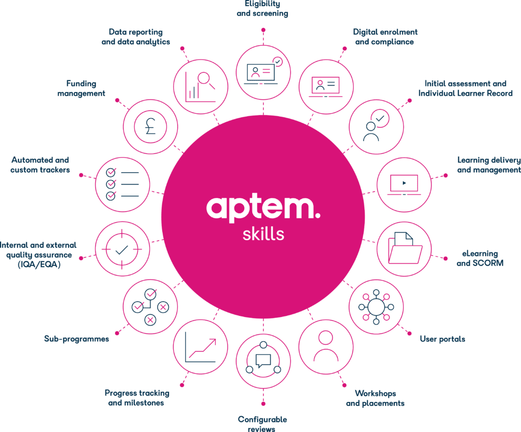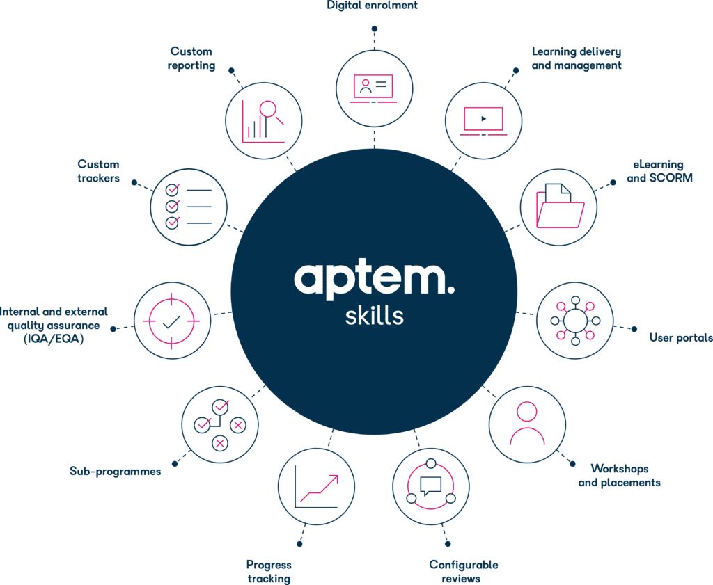 Aptem Skills is a configurable, end-to-end digital platform for delivering, managing, and tracking skills and training programmes at scale – supporting funded vocational provision and commercial training through a single, joined-up system.